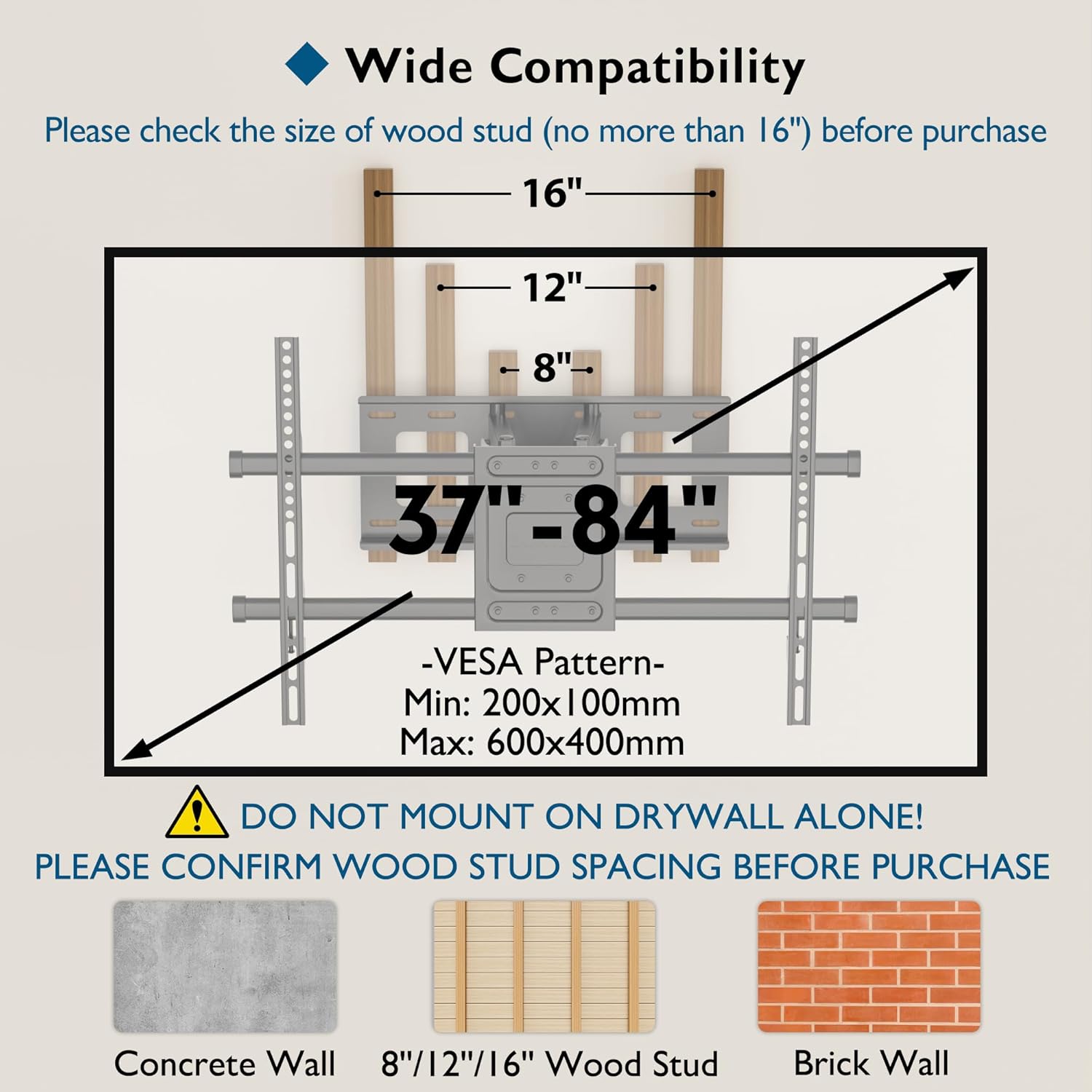 Universal TV Compatibility: Compatible with most 37-84 inch LED, LCD, OLED, 4K, and smart TVs, this mount supports VESA patterns of 200×100, 200×200, 300×300, 400×200, 400×300, 400×400, and 600x400mm, and supports TVs weighing up to 132lbs, ensuring compatibility with a wide range of TV models.