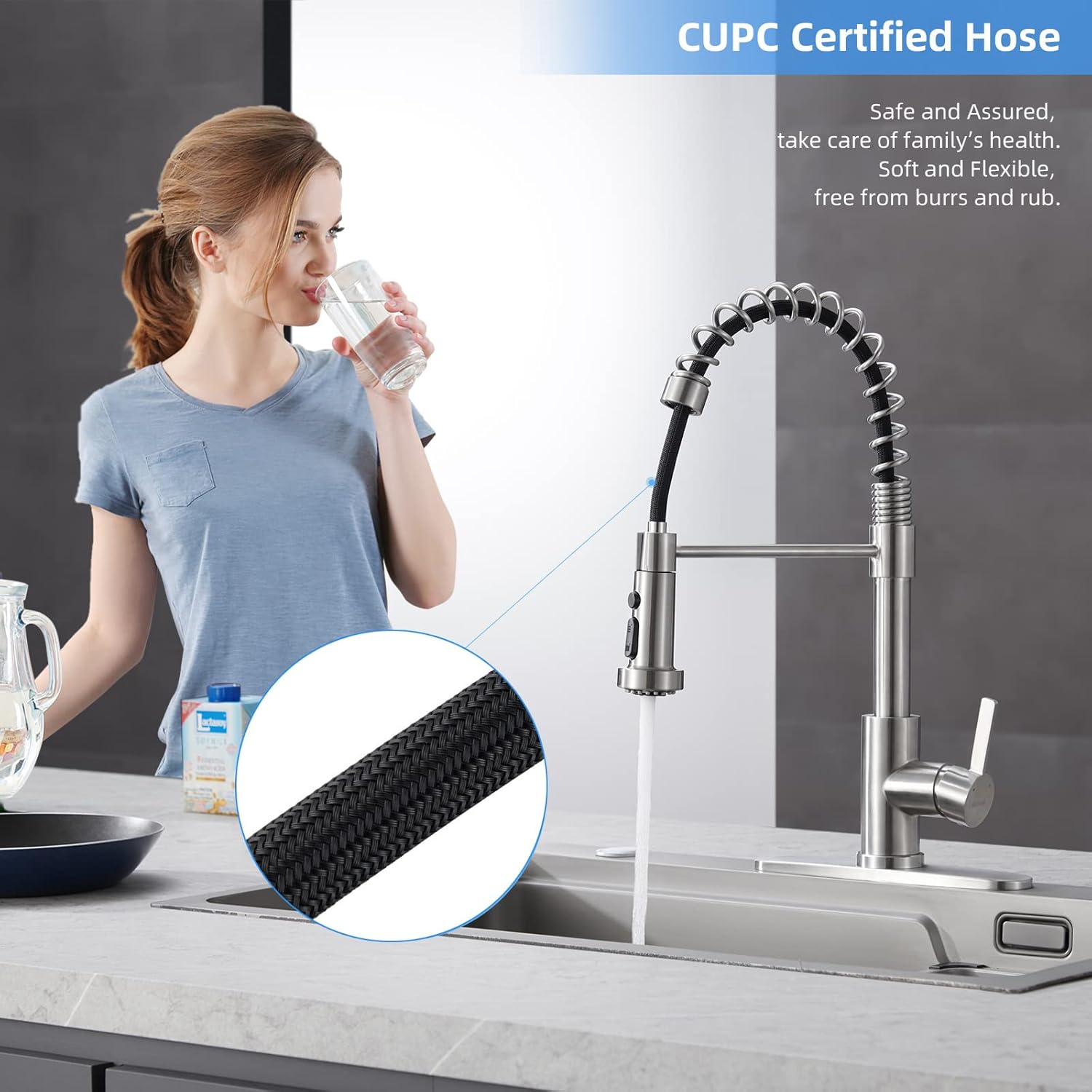 WEAR-RESISTANT FINISH will not fade or tarnish over time, keeps your kitchen faucet like new. CUPC certificated food-grade PEX hoses provide reliable healthy water flow, premium ceramic cartridge passed over 500,000 leak-free tests to ensure long-lasting performance.