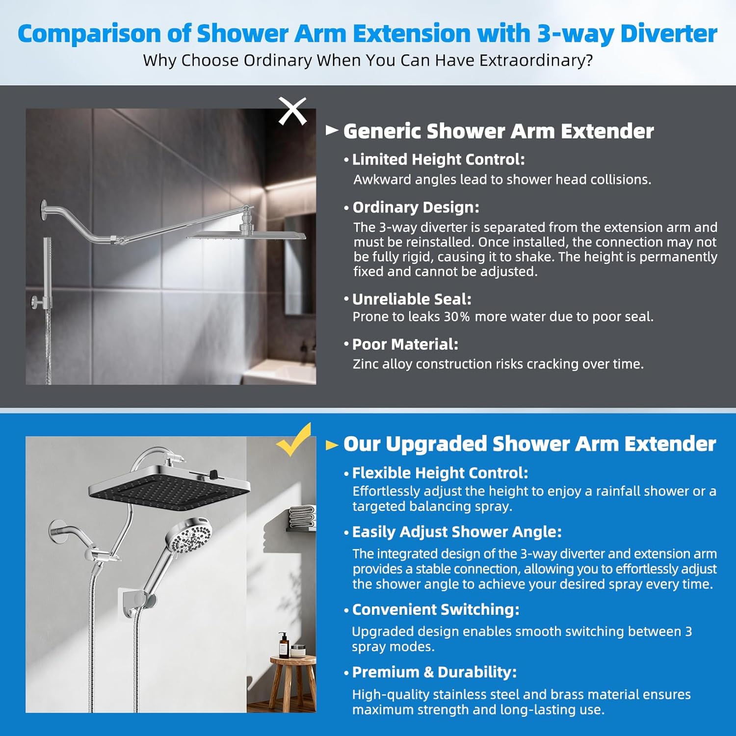 Upgraded 12” Extension Arm: The height and angle adjustable, curved design enhances its bearing capacity, allowing you to raise the shower head to achieve a vertical water. Compared to a regular shower arm extender, the Hibbent’s shower arm extension can raise or lower the shower head, and maintain it in a continuous horizontal position. This ensures the shower head remains perfectly vertical, without colliding with the arm, instead of sloping water like an ordinary straight shower arm extender