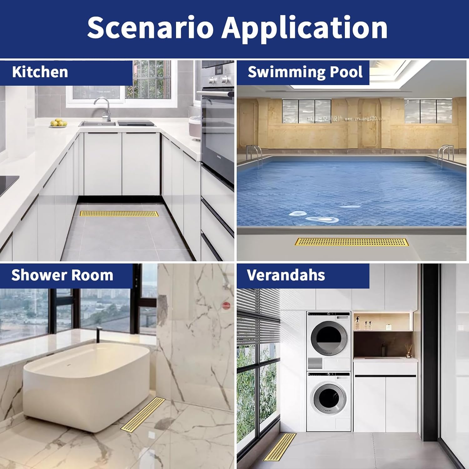 【Versatile Drains for Shower】Ideal for homes and businesses, this 24 inch brushed gold linear shower drain works in bathrooms, kitchens, balconies and more. Whether you need a functional shower floor drains or stylish shower drains, it delivers reliable performance.